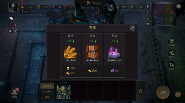 2、在你所在区域的右上方有神像、铁匠铺和商人,神像可以通过升级来提高英雄的放置上限和资源产出。